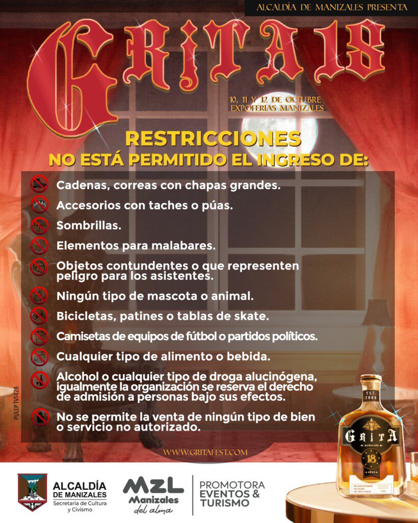 El Festival Grita 2025 celebra su mayoría de edad. Son 18 años de historia, música, en los que se ha consolidado como un ritual de encuentro, año tras año con la música alternativa. Este año, se vivirá esta nueva edición los días viernes 10, sábado 11 y domingo 12 de octubre, de 1:00 p.m. a 11:00 p.m. en el Centro de Eventos y Exposiciones Expoferias de Manizales. Grita 2025 cuenta con el apoyo de la Alcaldía de Manizales, la Secretaría de Cultura y Civismo y la Promotora de Eventos y Turismo de Manizales.