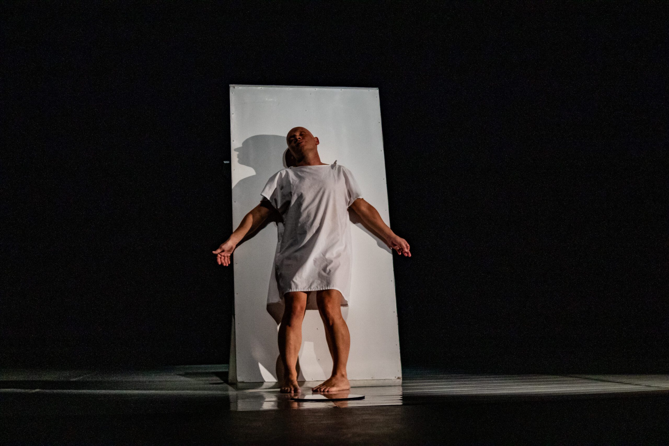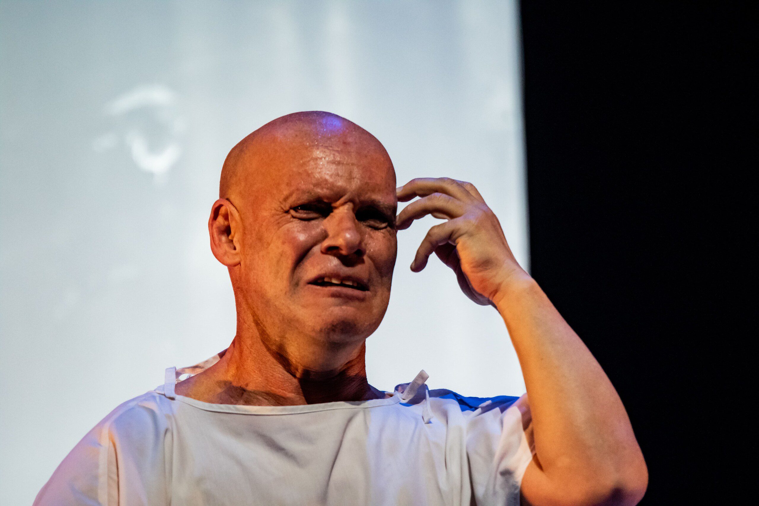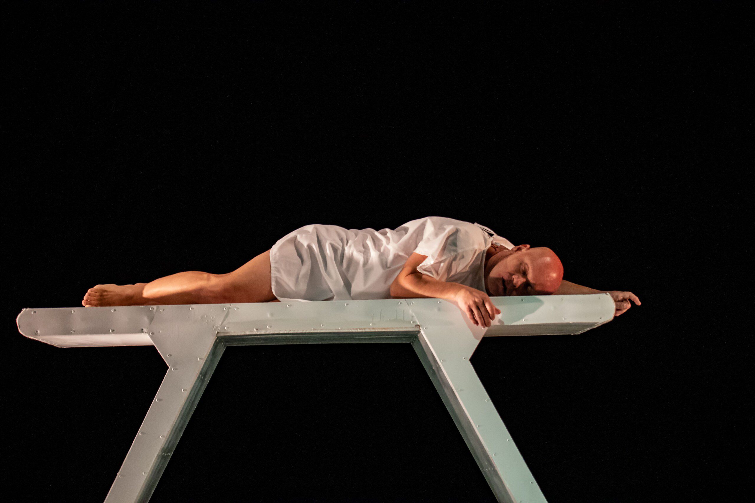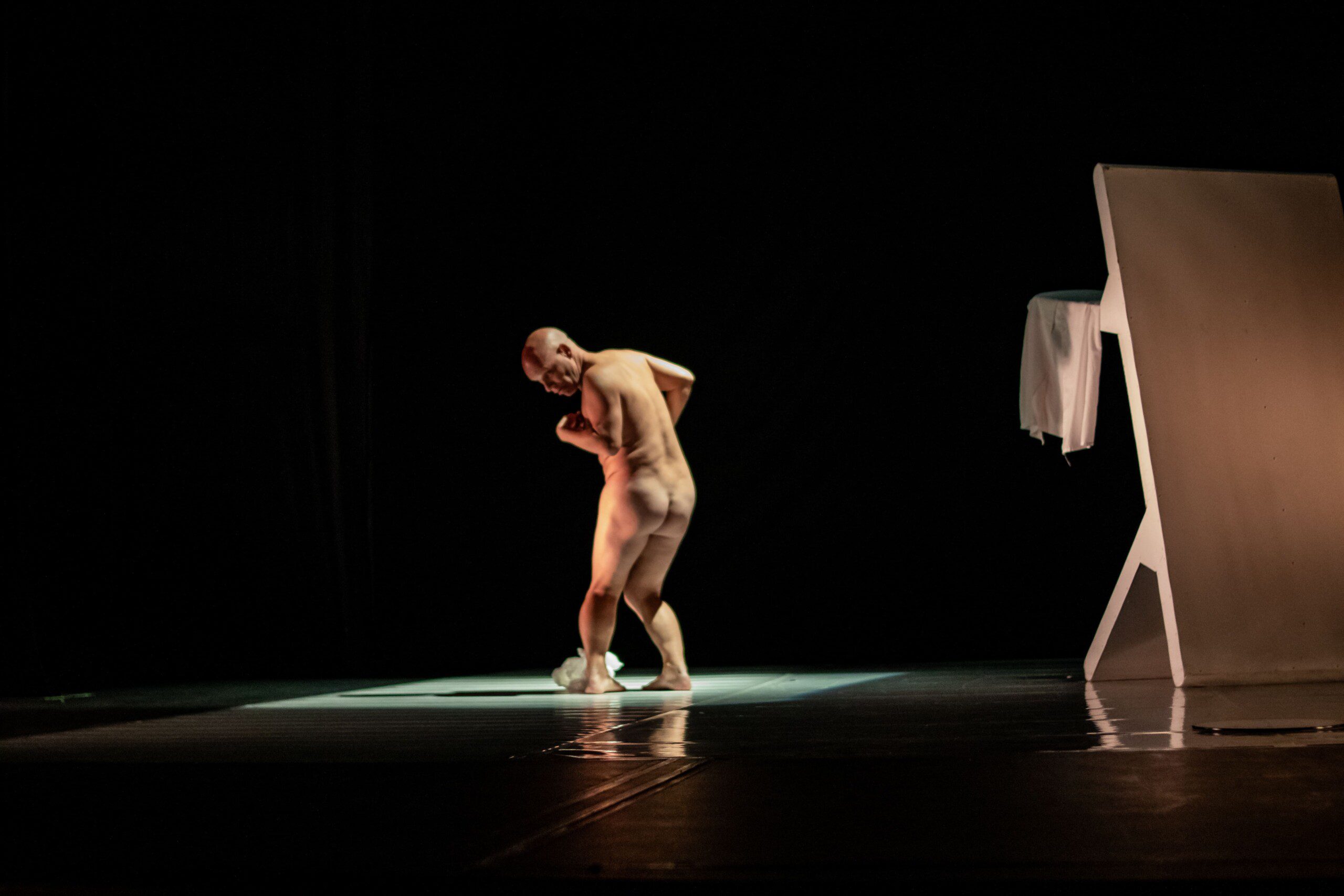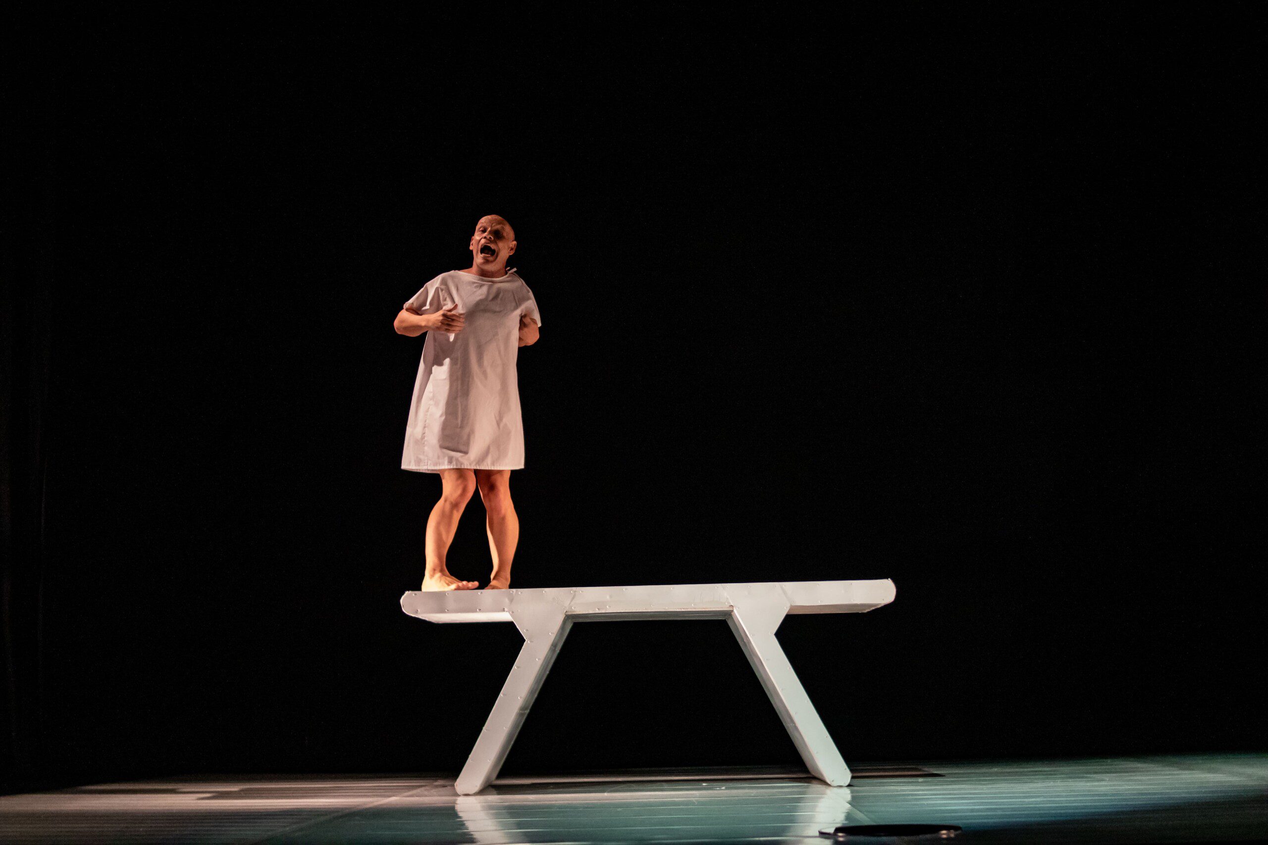El público no asiste a una narración, sino a una inmersión en la conciencia fracturada de un hombre recluido en un hospital psiquiátrico tras cometer un acto atroz. El escenario, despojado hasta el extremo, se convierte en la proyección física de esa mente quebrada. Una mesa, un cuerpo y una luz bastan para edificar un universo interior donde la palabra se vuelve herida y el silencio, eco de lo irrecuperable. Allí, Marín no interpreta: encarna. Su cuerpo vibra, se retuerce, se quiebra. Su respiración parece marcar el ritmo de una tragedia íntima, donde el horror y la belleza se entrelazan hasta ser indistinguibles.