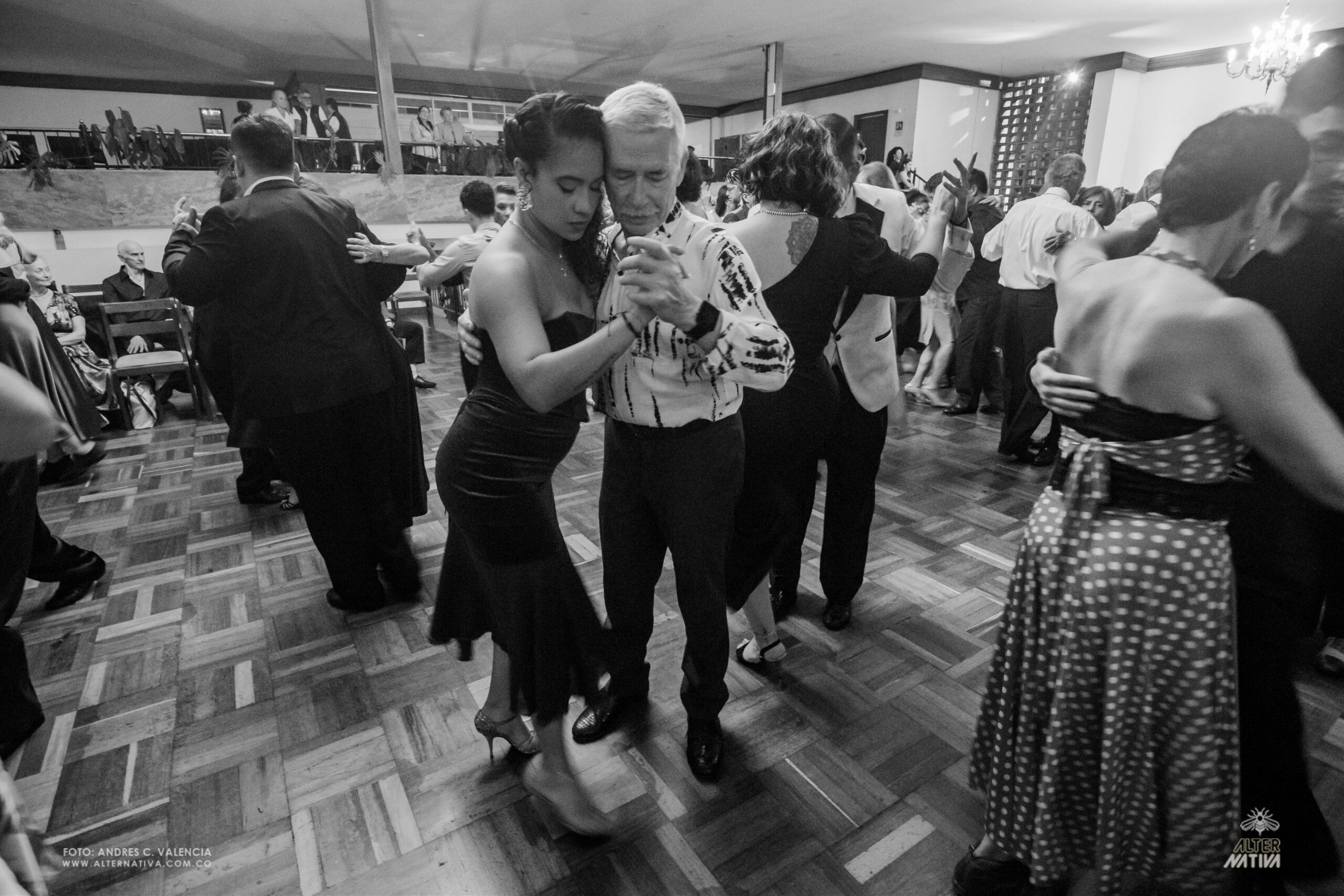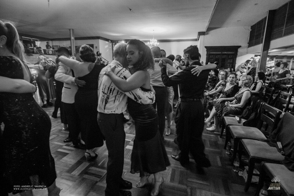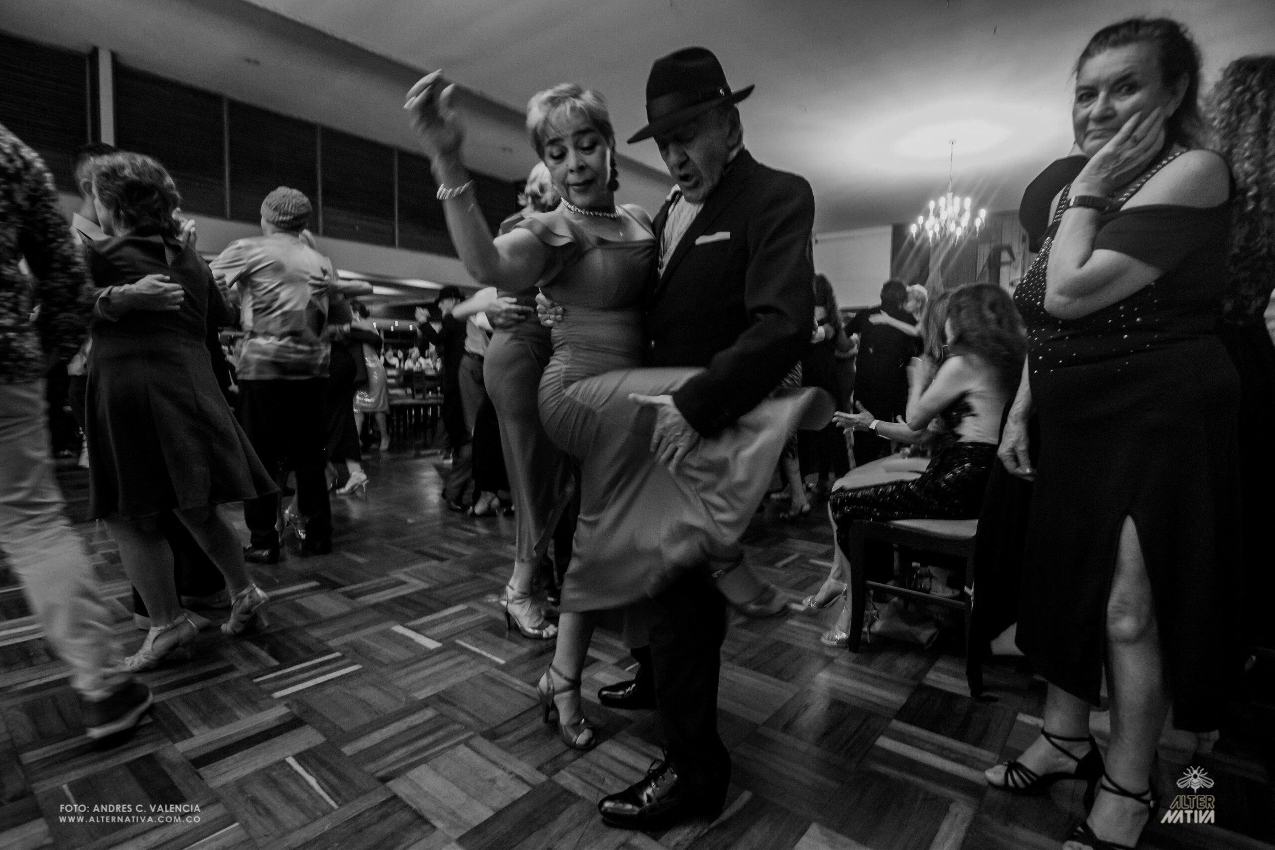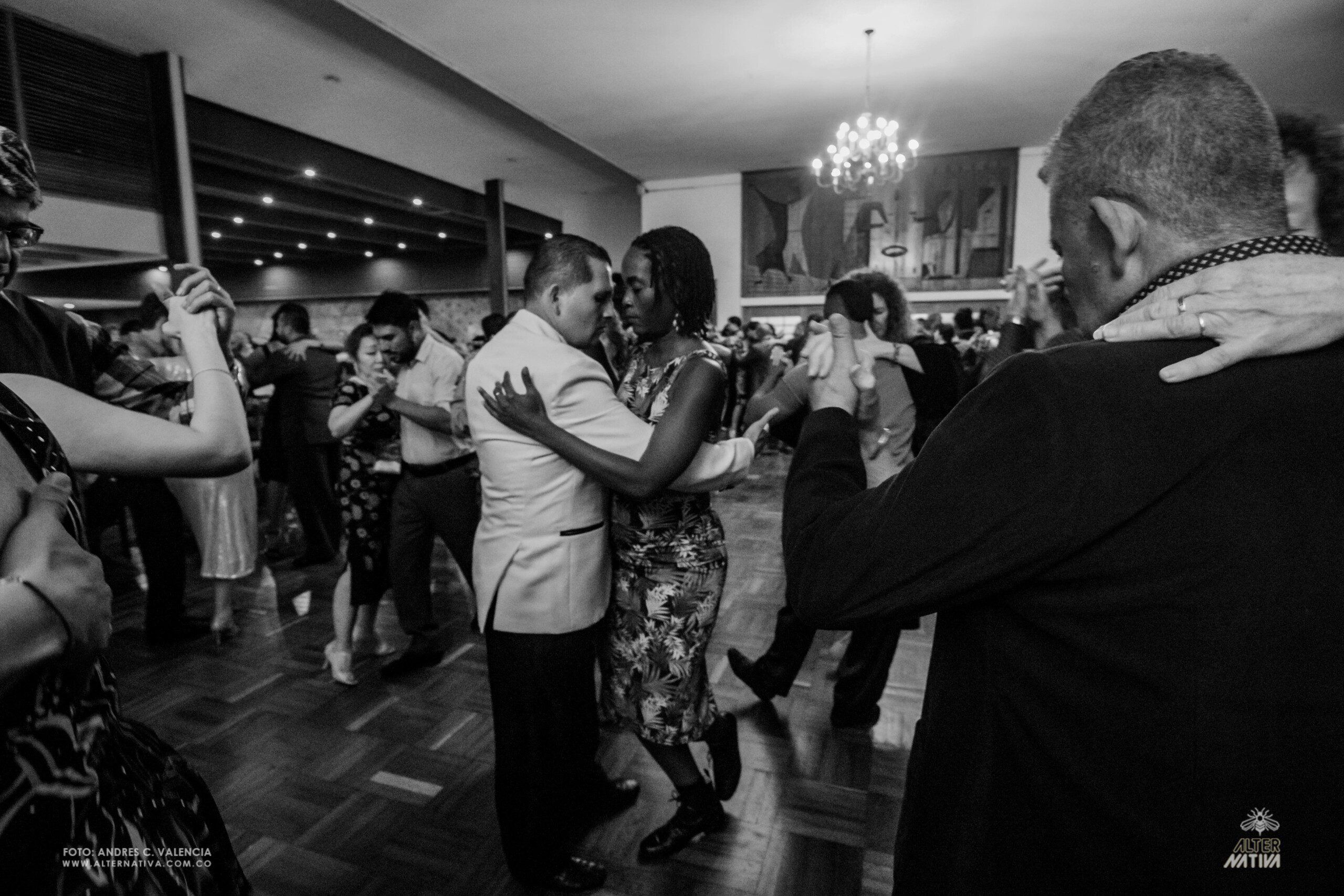A esa identidad de arrabal que se ha configurado en lo local, el Colombia Tango Festival pone en relevancia un oficio dentro de la milonga que pocos conocen: Los taxi dancers; son bailarines contratados para garantizar que nadie se quede sentado. El ejercicio de este oficio es presentado como una solución práctica dentro del festival. A primera vista, parece una forma amable de inclusión: garantizar que nadie se quede sin pareja en la milonga. Pero la estructura que lo sostiene pertenece a una economía, donde el saber y oficio del bailarín se convierte en un servicio, y el acto de bailar en un intercambio transaccional. Nadie lo llama abiertamente así, pero la lógica es inconfundible: alguien paga para que otro lo acompañe, para no ser invisible, para tener acceso al contacto físico y al rito del baile. El taxi dancer —esa figura contratada para circular de mesa en mesa, de silla en silla— evita la condena social del cuerpo quieto, del cuerpo que mira pero no participa.