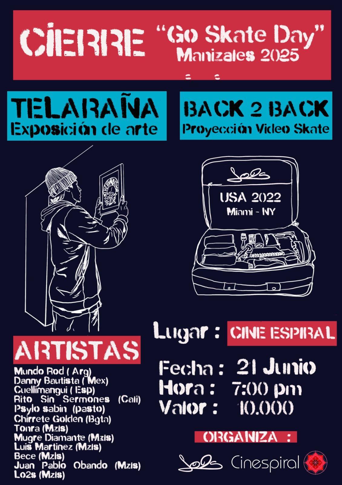 Una muestra de obras visuales que cruzan el arte contemporáneo con la estética y la filosofía del skate. Participan artistas de distintas regiones de Colombia, como Manizales, y también creadores internacionales desde España y Argentina.