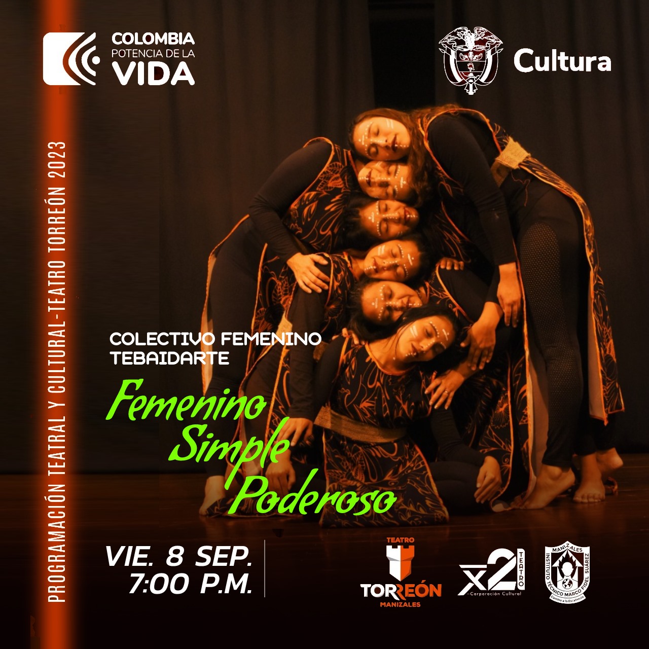 Femenino Simple – Poderoso, es una obra que recolecta historias cotidianas de mujeres y las vuelve poesía; historias que son tanto individuales como colectivas y que hacen las veces de reflejo de nuestra cotidianidad, trayendo al presente la necesidad de trabajar en pro de la sensibilización social y sin dejar de lado la importancia del papel femenino en nuestra sociedad. Un trabajo investigativo y de puesta en escena con música original de Joan Rubiel López Osorio del Estudio Musical Divisa Music, diseño y elaboración de vestuario de Olga Yaneth Sinisterra, actuado por el equipo de mujeres de la agrupación Tebaidarte: Ana Carolina Sanabria Ocampo, Manuela Ricurte Romero, Karen Andrea Diago, Olga Yaneth Sinisterra, Tulia Emily Palacio, Juliana María Buitrago, quien también es la directora de la obra.