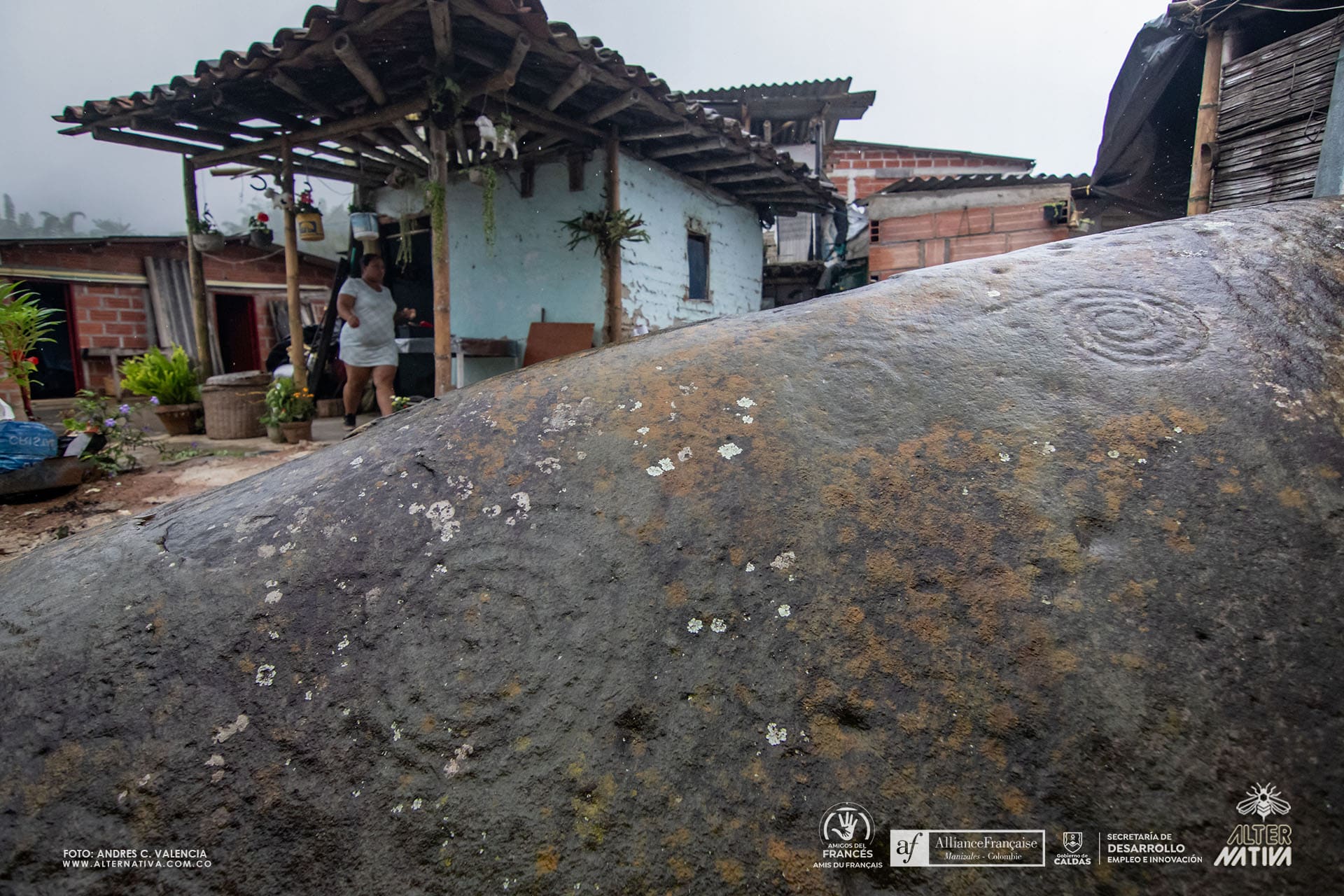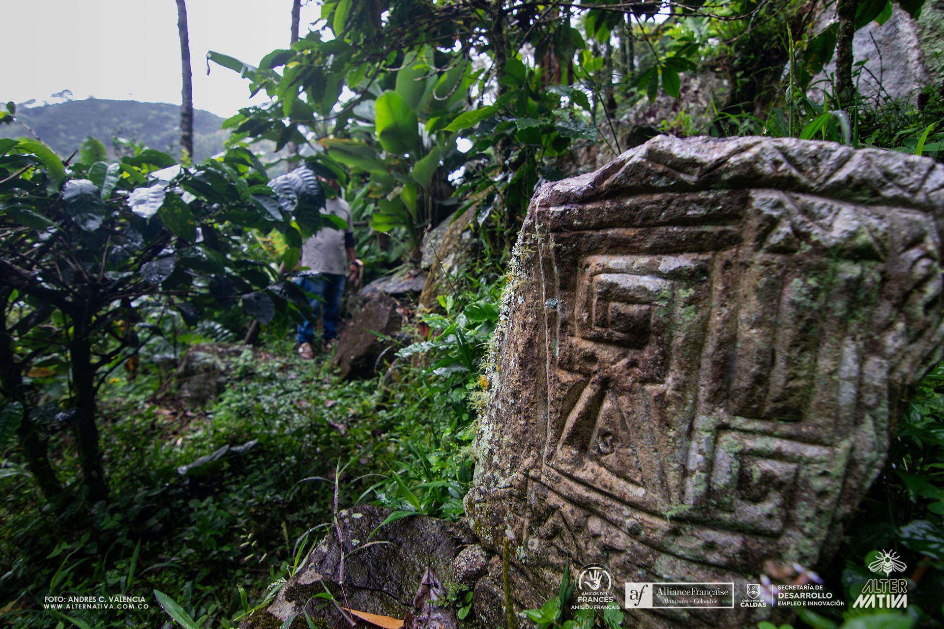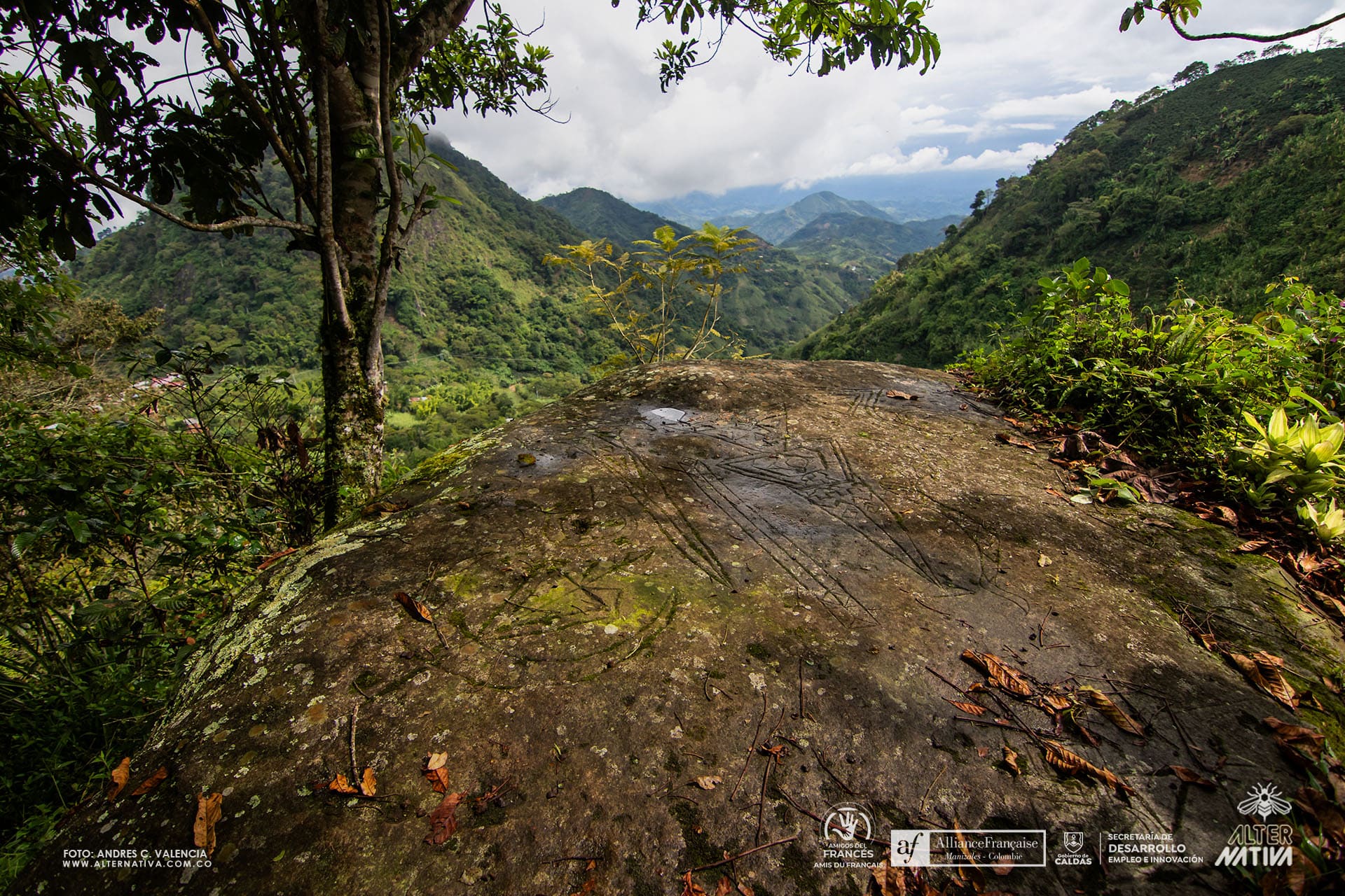 Ascendemos entonces por el cerro Karambá, también conocido como Batero. En frente, el Picará vigila como si llevara milenios en ese oficio. Entre ambas elevaciones se forma un corredor natural que parece dirigirnos a una roca final, invisible desde abajo, pero cargada de señales que el viento no ha podido borrar. Los límites no son un tema turístico, en un paso está en Caldas, el siguiente en Risaralda. “Aquí comienza Quinchía”, señala Hernando, como quien aclara dónde empieza el patio del vecino.