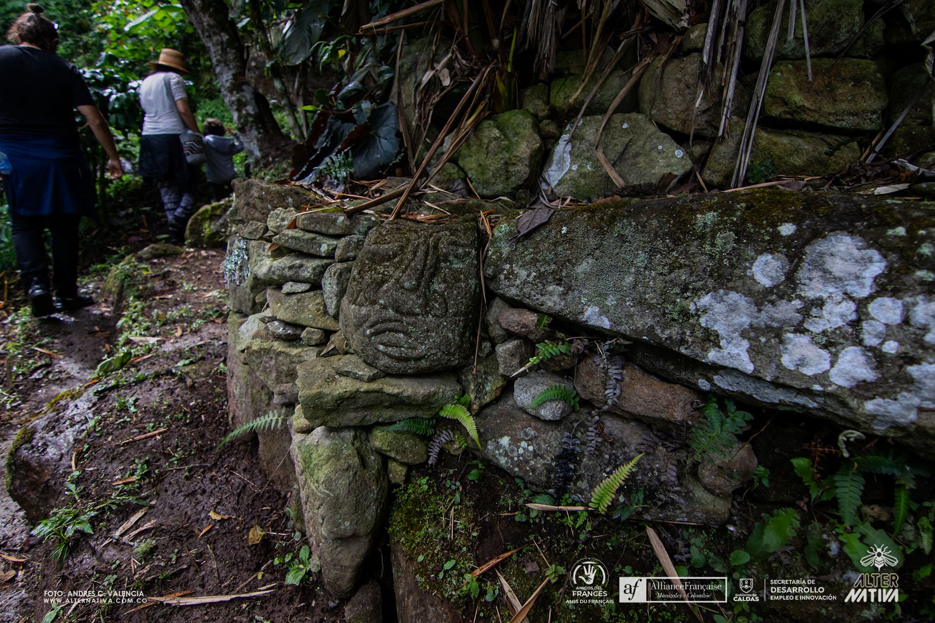 Antes de subir, el cuerpo se prepara con un desayuno hecho por manos locales. En el pie del cerro Karambá, en la cocina Currucutao, huele a leña, y los utensilios no son decoración ancestral sino herramientas cotidianas: barro, piedra, cayanas. Sobre una roca, un petroglifo tallado como la figura de un ave. Emilsa, anfitriona del lugar, sirve café y arepas de maíz mientras señala la piedra. “Ese es el currucutá, la lechuza guardiana”, explica, con la misma naturalidad con la que ofrece otro tinto.