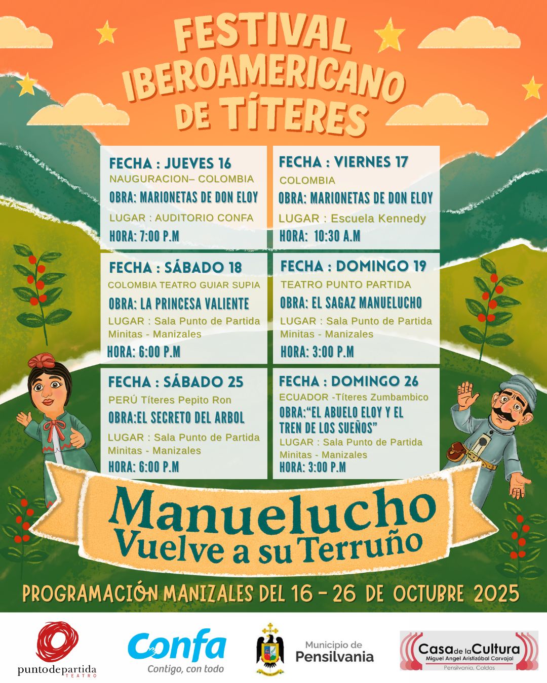 Del 16 al 30 de octubre de 2025, los escenarios de Manizales y diferentes municipios de Caldas se llenarán de color, creatividad y alegría con una nueva edición del Festival Iberoamericano de Títeres, un evento dedicado a la infancia y a la tradición titiritera de nuestro país.
