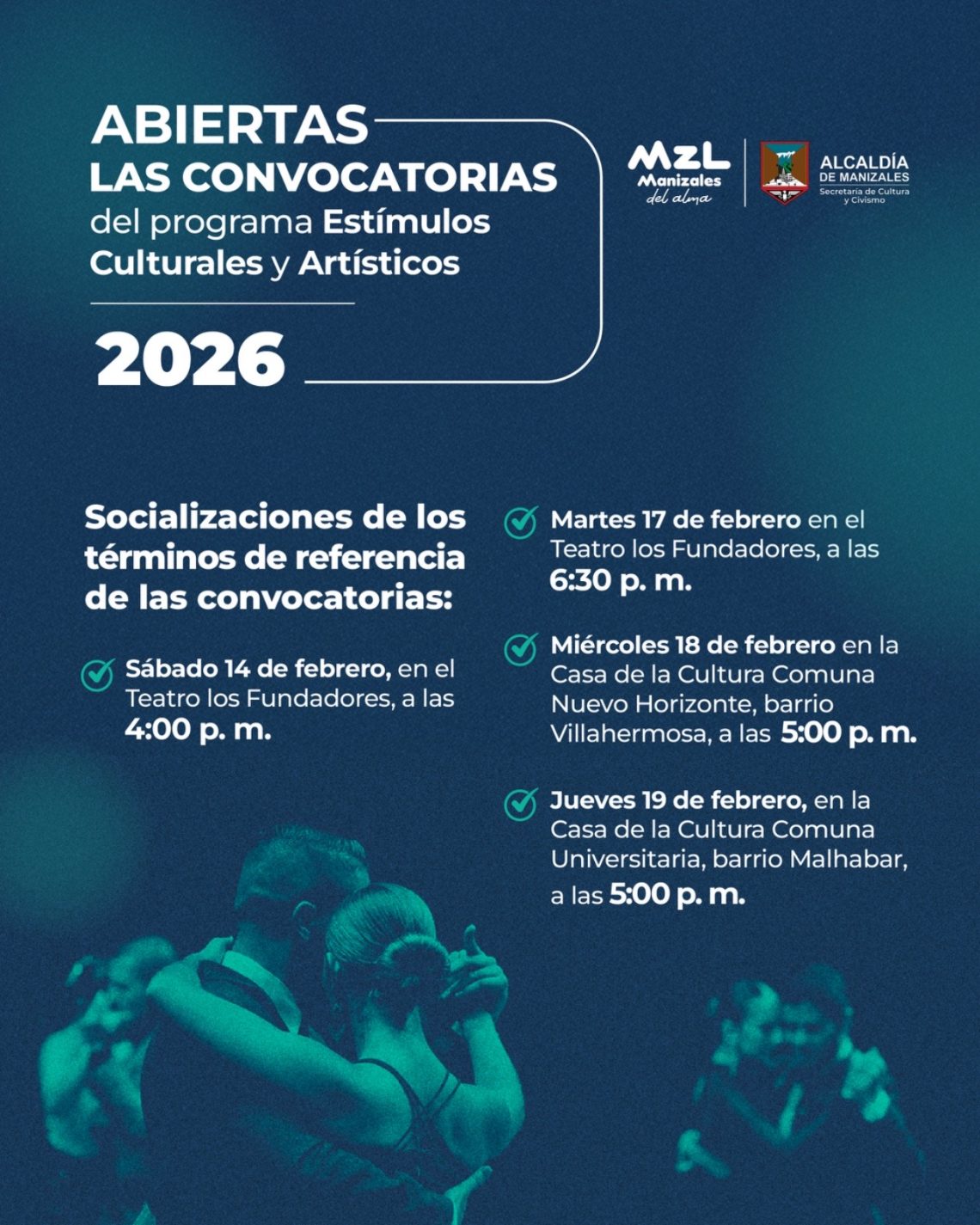 “Todos los artistas y gestores culturales están invitados a participar en la convocatoria de Estímulos 2026. Recordamos que quienes hacen parte de la Ley de Espectáculos Públicos también pueden postularse. Además, este año tenemos una novedad: la apertura de la convocatoria de Estímulos de Cultura Ciudadana”, Expresó, La secretaria de Cultura y Civismo, Paula Londoño Vallejo.
